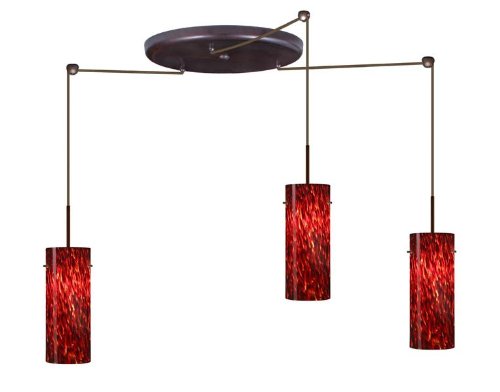 #Glass:Garnet, Cage:No Cage, Light Bulb:(3)100w A19 Med F Incand, Finish:Bronze Three-light multi pendant with handcrafted glass shades. 3x stem hooks included. 10' SVT-type cord, complete with 5 decorative sleeve at the socket holder. Jacket coordinates with metal finish. Plated stamped steel construction canopy. Installs directly to a 4 octagonal ceiling box. Suitable for sloped ceilings.