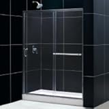 Dreamline Shower Door & Base Combo DL-6091R-01FR ChromeDreamLineTM introduces shower door and matching shower base. INFINITY PLUS Door is available in clear or frosted glass with options of chrome or brushed nickel for the aluminum frame and guide rails. All AMAZON shower bases come standard with slip-resistant textured floor patterns and 3-side integrated tile flanges. Each shower base is fiberglass reinforced and comes with an opening ready for a standard compression fitting drain.