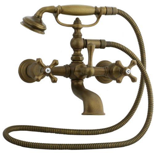 #Finish:Aged Brass, Faucet Centers*:8' Widespread (2 holes) The Highlands collection utilizes a blend of exposed mounting and a pillared spout to create a unique traditional look. Brass cross handles 8' centers, 2-hole wall mount installation ' inlets with unions Spout extends 7' from wall Integral handshower kit Includes rough valve